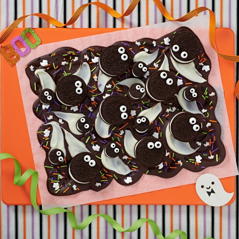 Use back of spoon to spread white chocolate into long swirls to resemble 16 ghosts.